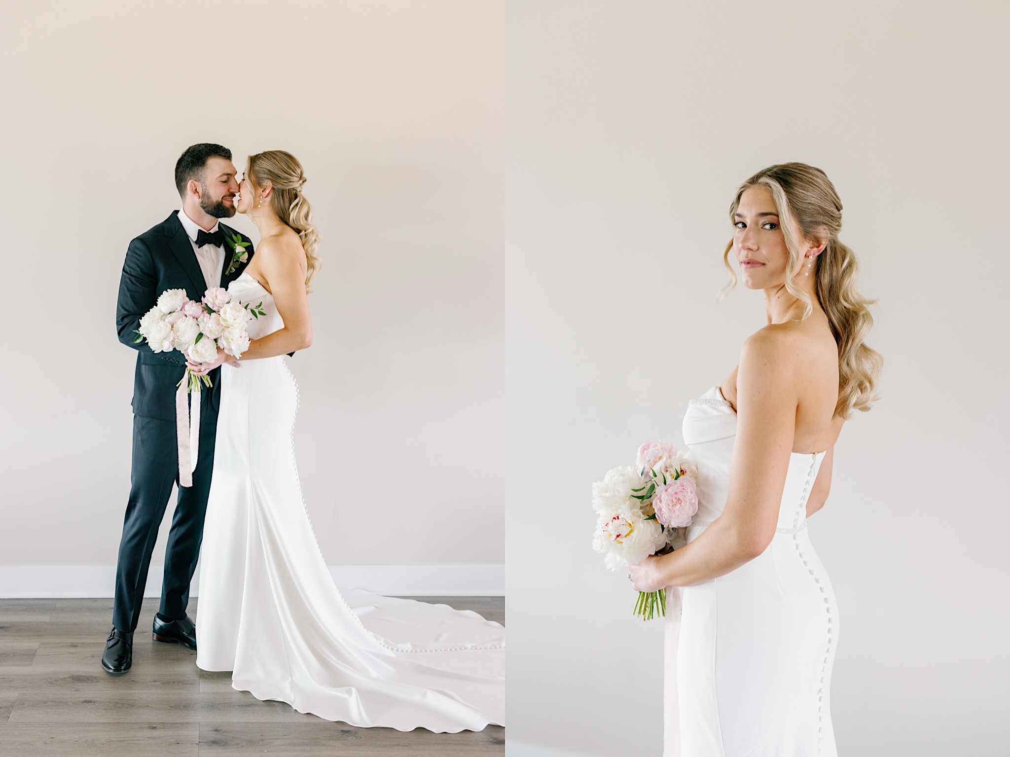 19_Wedding Photos bride and groom at Toast Ankeny_Bride with white and pink peony bouquet