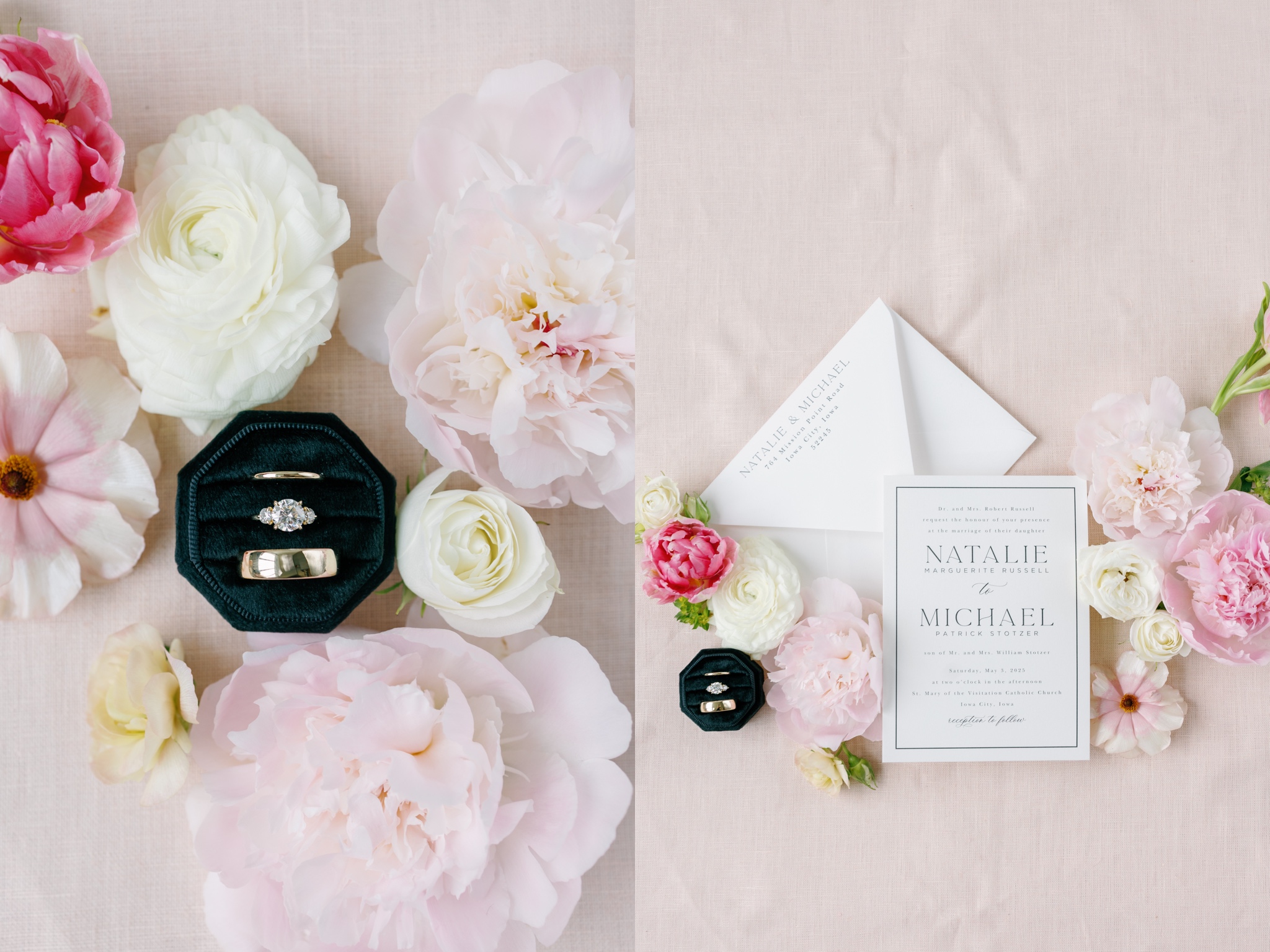 Light pink and fuchsia peonies with white wedding invitations and black details